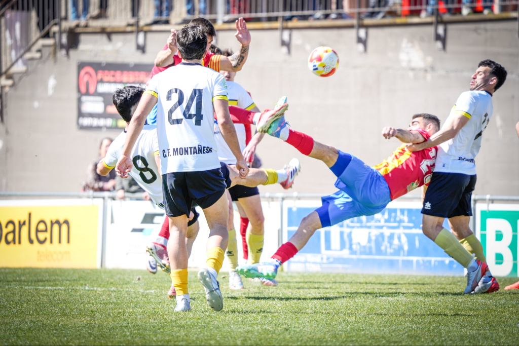 Marc Roquet ho intentava amb una rematada acrobàtica. Font: Adrià Pla